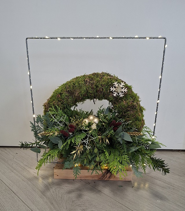 Echt een bijzonder Kerststuk, even wat anders dan anders! De basis voor dit stuk is een ijzeren frame op een houten voet. In het midden zit een krans van stro, deze ga je bekleden met mos. In de krans komt een mooi stuk op oase van diverste soorten groen en andere materialen zoals eucaluptus. Dit groen droogt mooi in zodat je extra lang van je decoratie kunt genieten. Uiteraard maak je het geheel af met lampjes, kerstballen en andere decoraties. Het ijzeren frame is 40 x 40 cm. (het kerstgroen kan afwijken van het voorbeeld)