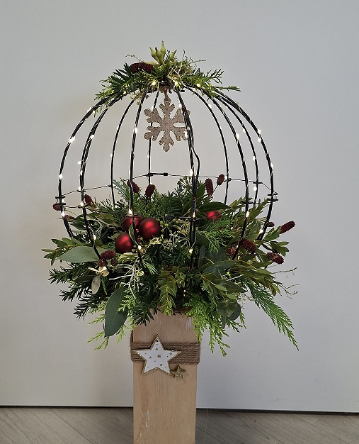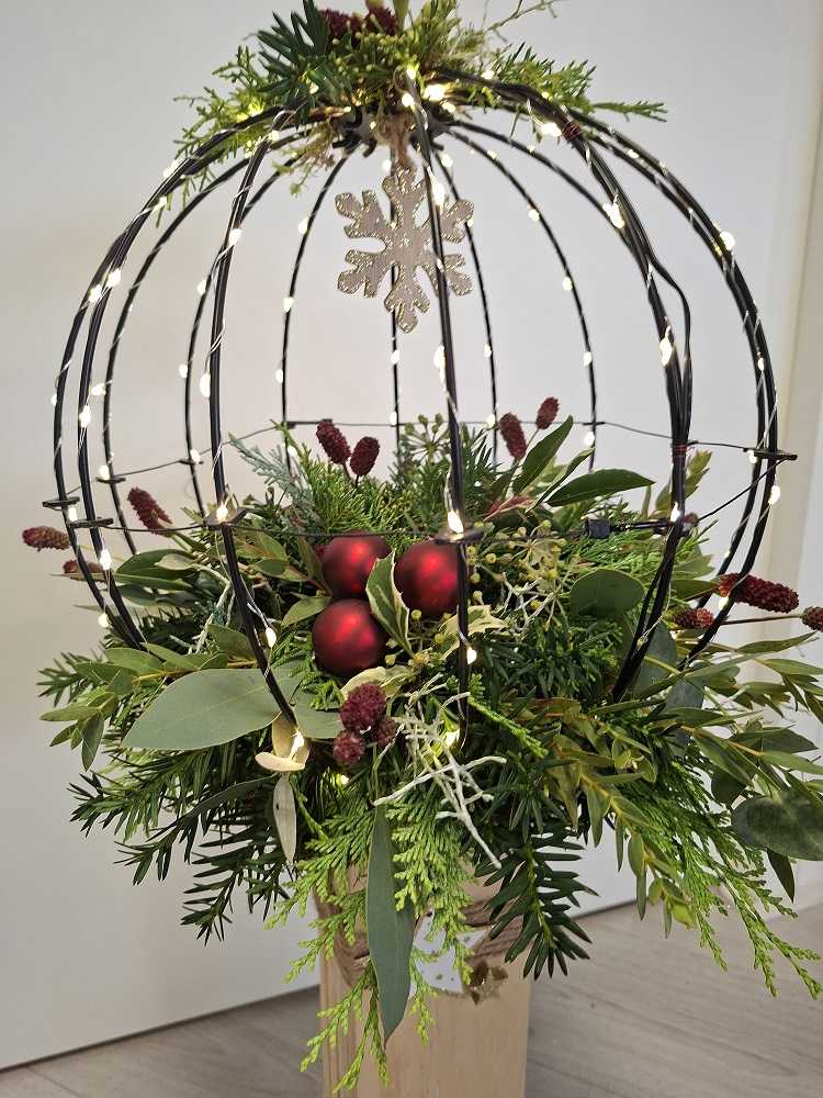 Dit is ook echt mooi hoor, een echte eye-catcher op de kersttafel! De basis is een metalen bol met lampjes erin. Dit frame staat op een houten voet van ca. 25 cm. In het midden van de bol ga je een mooi kerststuk maken op oase. Er is tijdens de workshop keuze uit diverse soorten dennengroen en andere materialen zoals steeneik en diverse soorten eucalyptus. Je kan het helemaal naar eigen smaak maken. Ook dit stuk maak je helemaal af met kerstballen en overige kerstdecoraties. De bol heeft een doorsnede van 30 cm. In totaal wordt dit stuk dus ca. 55 cm hoog. (het kerstgroen kan afwijken van het voorbeeld).
