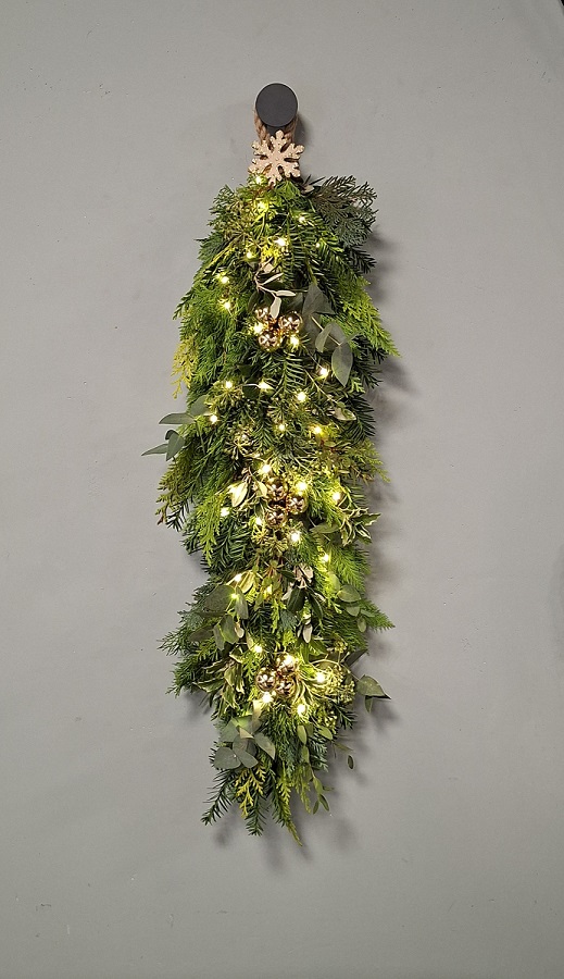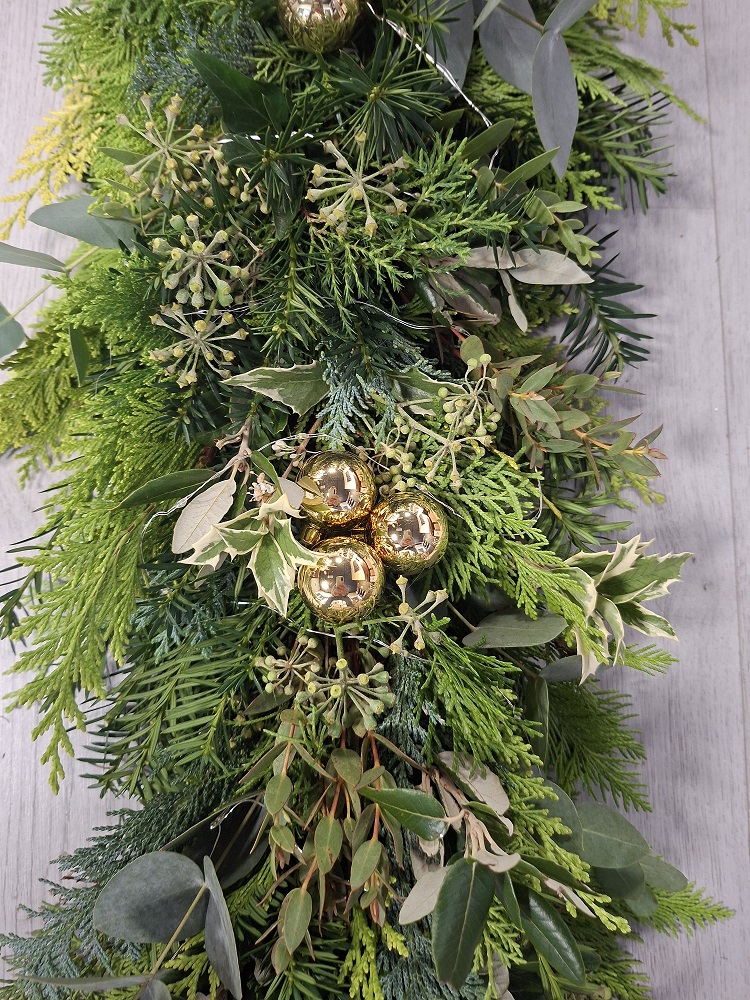 Wil je liever iets maken wat je aan de voordeur kunt hangen of op de tafel kunt leggen? Dan is dit ook echt een mooie Kerstdecoratie! Deze Kersttoef is ca. 70 cm lang (inclusief de ophanglus). Je kunt ook aan beide uiteinde een lus maken zodat je het op kunt hangen als een guirlande. Dit mag je uiteraard helemaal zelf bepalen. Je gaat diverse toefjes kerstgroen met ijzerdraad op een dik touw bevestigen. Op deze manier maak je de toef mooi vol. Uiteraard maak je het geheel helemaal af met lampjes en kerstdecoraties naar keuze. (het kerstgroen kan afwijken van het voorbeeld)